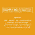 Ingredients: Water, Cane Sugar, Lime Craft Juice Concentrate (Apple Juice Concentrate, Pear Juice Concentrate, Lime Juice Concentrate, Natural Flavor), Lemon Juice Concentrate, Fresh Ginger, Ginger Extract (Alcohol, Water, Ginger Oil).